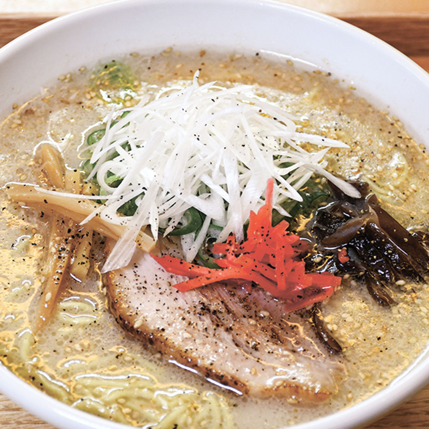 根強いファンに支持される「塩らぁめん」は、豚骨のほのかな甘みが感じられるスープが特徴。濃厚ながらも深みと旨味があり、後味はすっきりとしています。ほどよくコシのある中細麺がスープと絶妙に絡み、シャキシャキとした白髪ねぎや紅ショウガがアクセントとなって、繊細な味わいをさらに引き立てます。