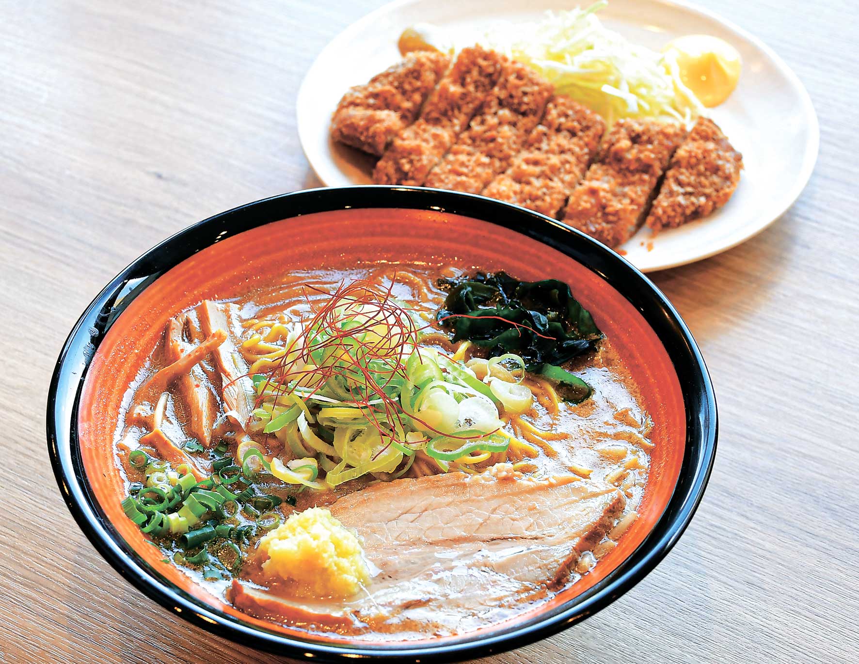 香ばしく焼き上げた味噌の粒感を残した、米麹のコクとスパイスが織りなすクセになる味わいです。麺は中細の旭川麺とコシの強い札幌麺からお好みで。さらに、ファン待望のとんかつが復活!ぜひ、セットでどうぞ。